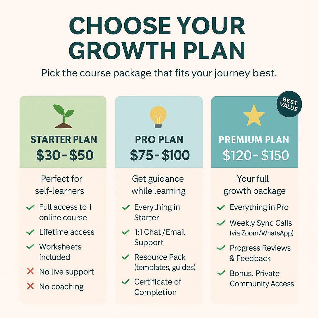 Are you here to master Afro hair care? Do you want to learn marketing with AI tools? Maybe you plan to start your online business. Whatever your goal, we’ve got a plan designed just for you.